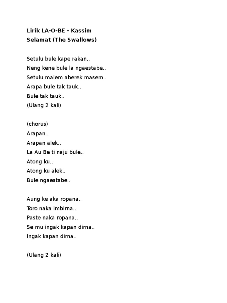 La Obe Lirik. Jangan lupa juga untuk membeli atau mendownload lagunya di berbagai platform musik digital seperti Spotify Itunes Joox dan Lainya. Lirik LA-O-BE - Kassim Selamat The Swallows Setulu bule kape rakan.